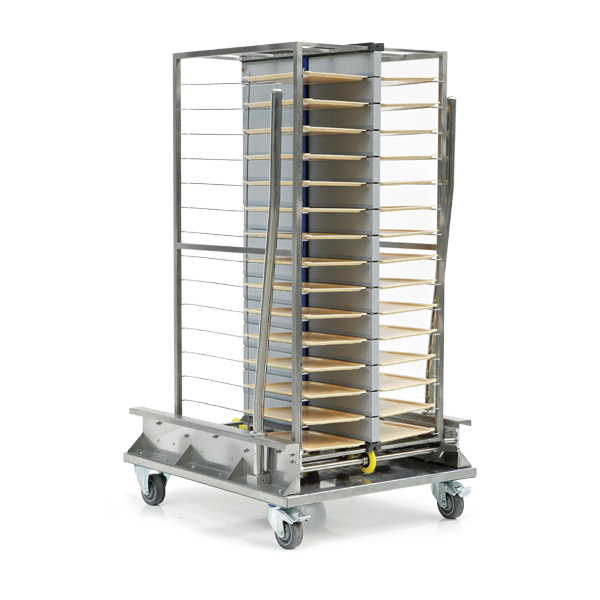 Option 3- Tray Transport Kit Trolley This trolley is used for transporting the TRAY TRANSPORT KIT where the trays are placed. With the lock system on the trolley the KIT can be fixed safely. Trolley provides the KIT convenience when placing and removing on a Hot & Cold Trolley in a correct way. There are no heat transitions around the KIT that are located correctly. Also to collect the used trays from the patient floors can be done by KITs and this trolley can be used in this purpose. Trolley is light weight and has an ergonomic design for the user needs. Users can easily move within the hospital.