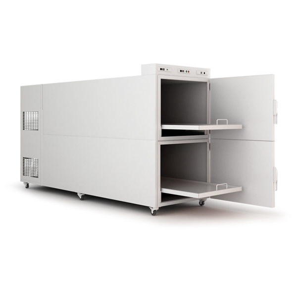 - Internal Cooling Unit - Air blow cooling system. - R134A cooling type - Stainless Steel inner chamber - Digital Thermostat - Easy to move with wheel system with brakes - Independent controlled double compartment - Life symptom sensor - Fan cooling system - Integrated rack system inside the cabinet